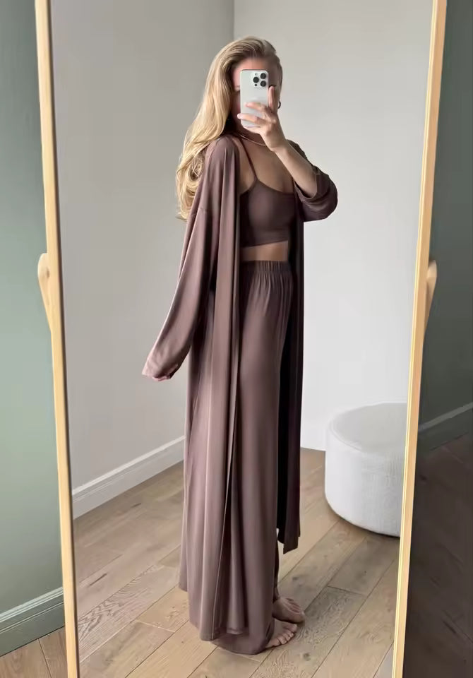 "Girls, this set is gorgeous! Comes with a top, pants, and a cape. Made of 95% modal and 5% spandex, the fabric is thin, super soft, and feels amazing. It drapes so beautifully!"
